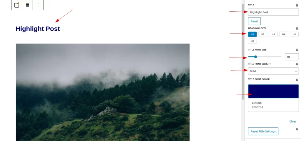 In this feature, the user can easily customize the block’s title name. By default, the title is set to ‘Post Highlights’. Additionally, a reset button is provided, allowing the user to reset the title to its default state.